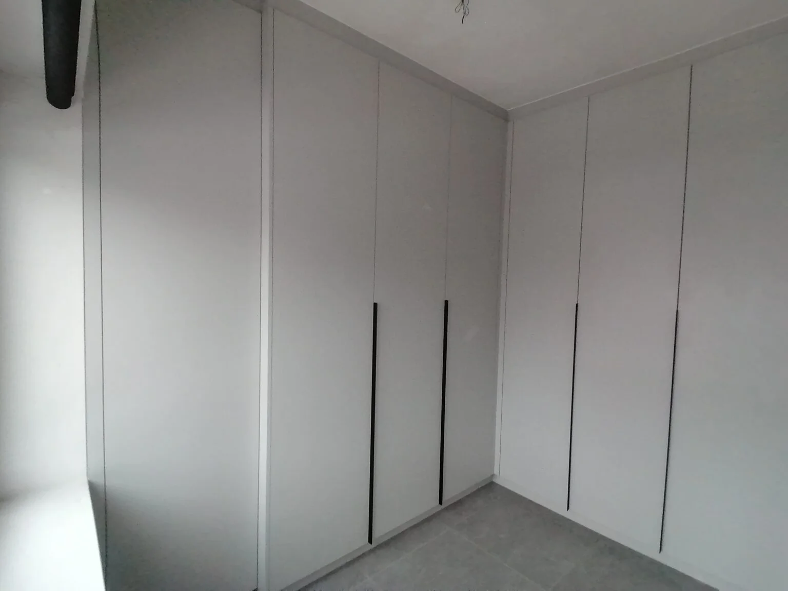 Hier mochten we ruimte aankleden met deze moderne / tijdloze dressingkast. De hoekkast zorgt ervoor dat de ruimte optimaal benut werd. Een indeling op maat volgens de wensen van de klant. Hier werd gekozen voor lades, legplanken, broekenrek en hangbaren. De lange zwarte grepen zorgen voor een strakke look.